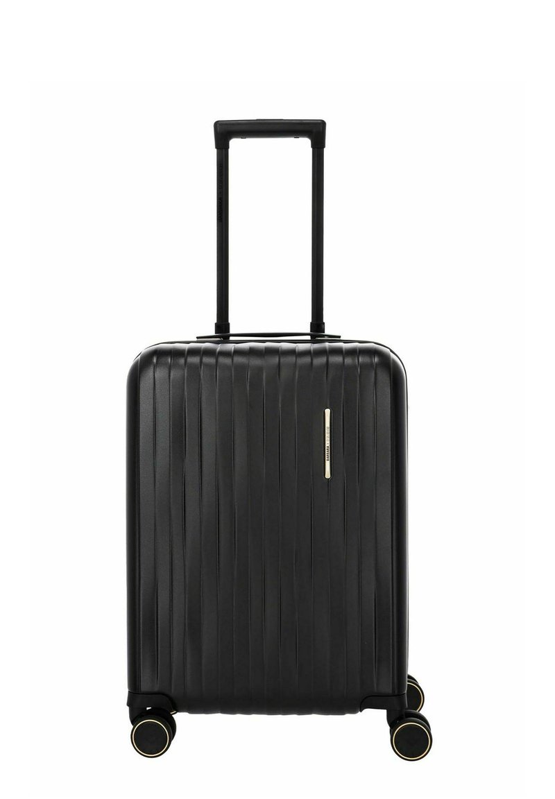 Maleta rígida negra con estrías verticales, cuatro ruedas dobles giratorias y un asa telescópica extendida.