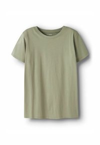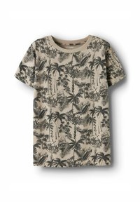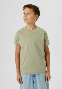 Niño con cabello corto y castaño, vestido con una camiseta beige claro y jeans azul claro, mirando ligeramente hacia arriba y a la izquierda contra un fondo liso.