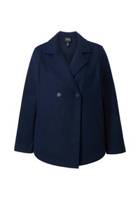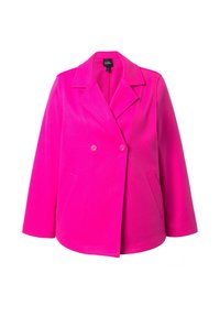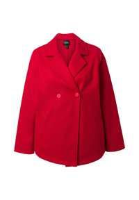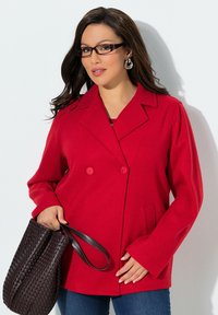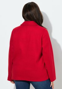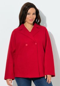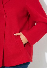 Mujer de cabello largo y oscuro, vestida con un abrigo rojo cruzado y jeans azules, de pie frente a un fondo claro.