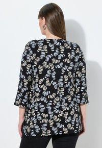Blusa negra con un patrón de mariposas en crema y azul claro, con mangas tres cuartos, detalles fruncidos y un escote redondo.