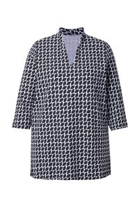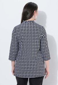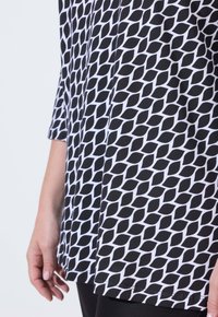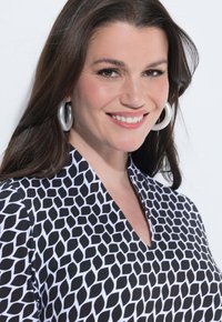 Mujer con cabello largo y oscuro que lleva grandes pendientes de aro blancos y una blusa de manga tres cuartos con un patrón geométrico en blanco y negro.
