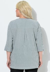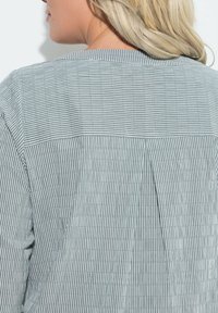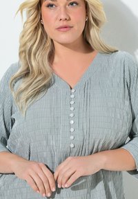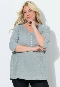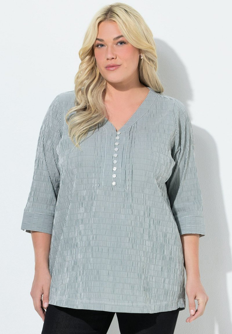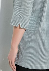 Mujer rubia con cabello suelto y ondulado, vistiendo una blusa gris claro a rayas con cuello en V, botones y mangas tres cuartos, de pie frente a una pared blanca.