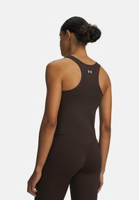 Top corto marrón de tirantes hechos de material elástico, con tirantes anchos y detalles de costuras verticales para añadir textura.