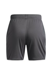 Pantalones cortos deportivos grises hechos de tela que absorbe la humedad, con cintura elástica y detalles laterales blancos. Logotipo de Under Armour en plata.