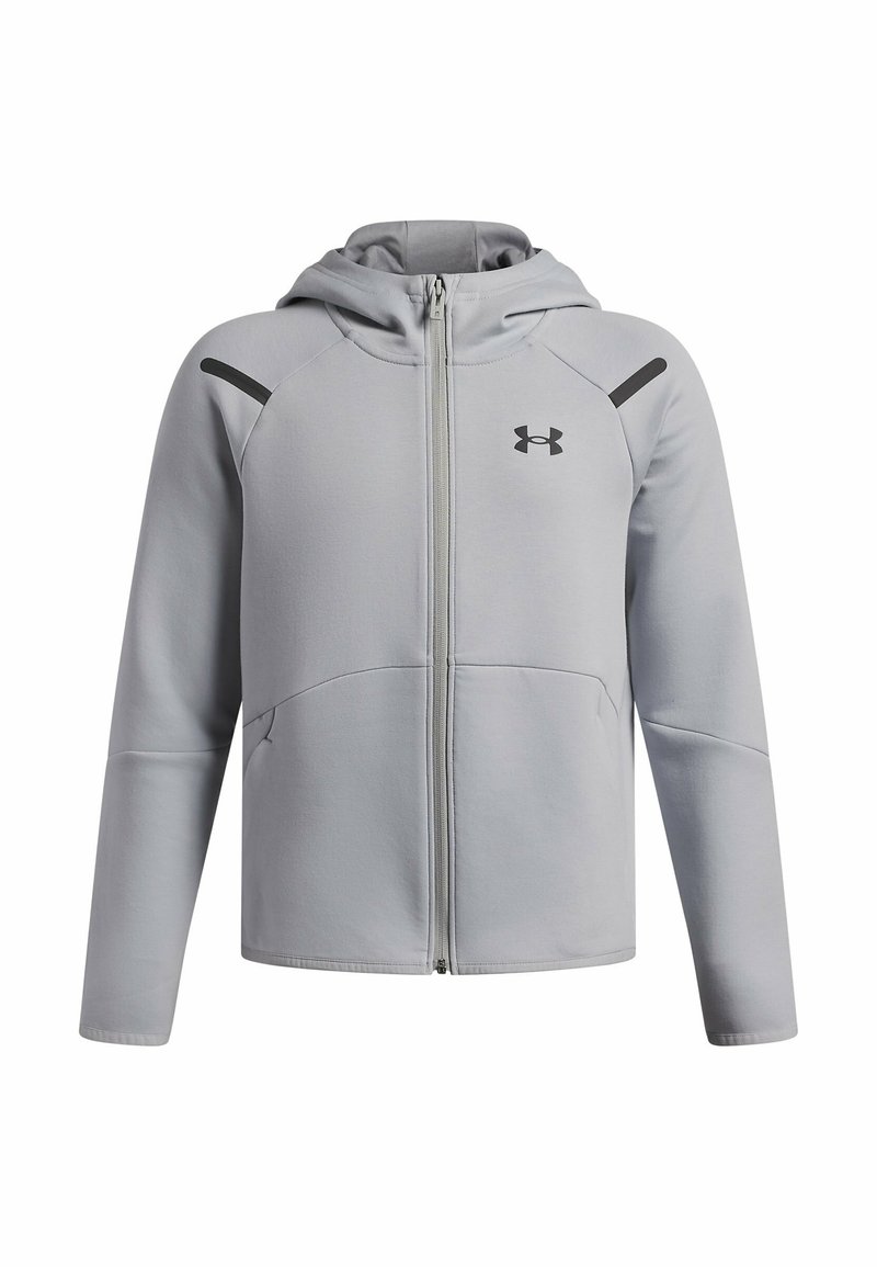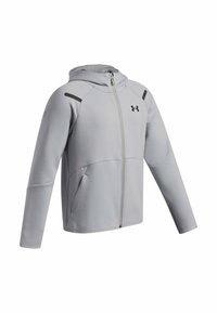 Sudadera con capucha de cremallera completa de color gris claro, con capucha, mangas largas, dos bolsillos delanteros y un pequeño logotipo negro de Under Armour en el pecho.