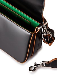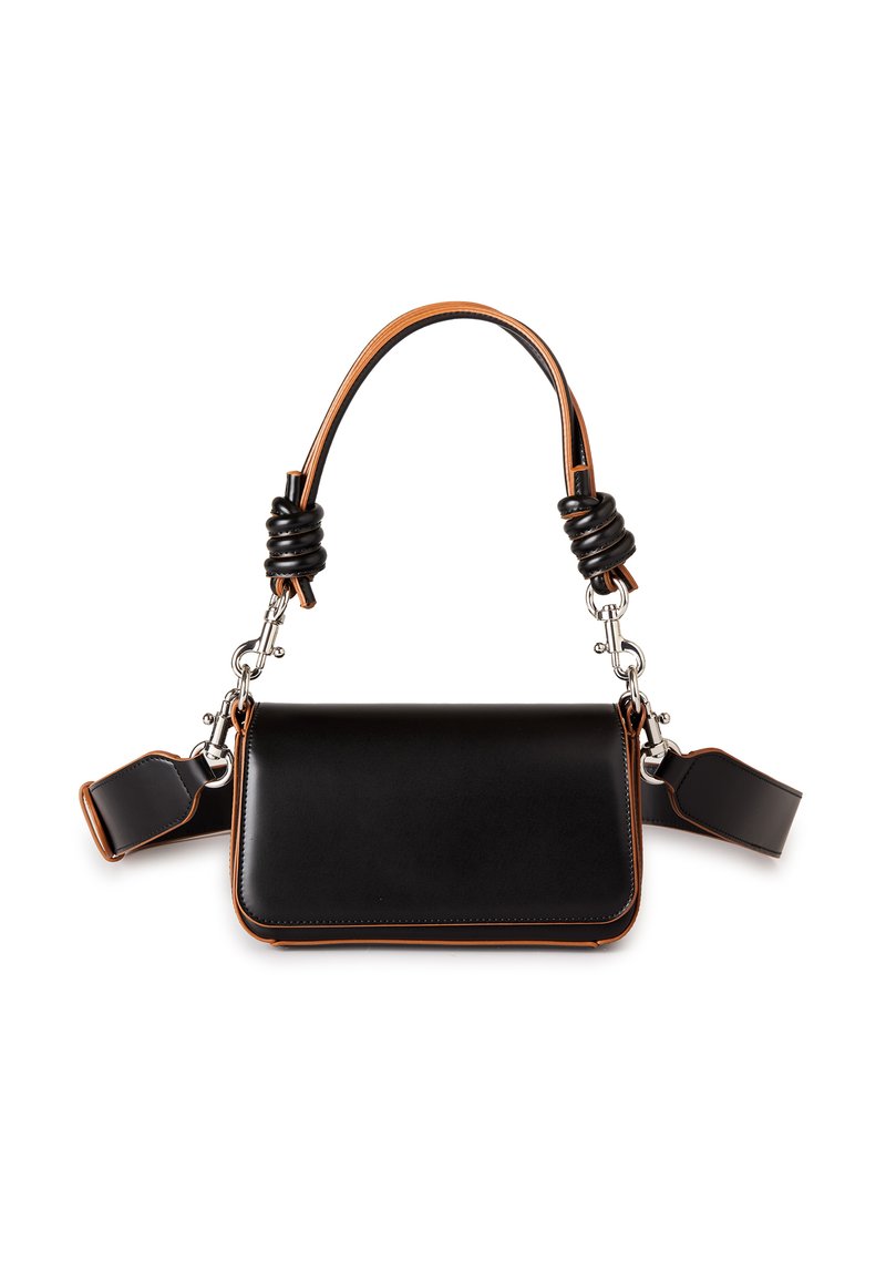 Bolso de mano rectangular de cuero negro con bordes marrones, asa anudada y correa de hombro ancha desmontable con cierres plateados.