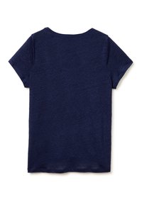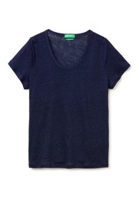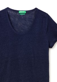 Camiseta de mujer de manga corta en azul oscuro con escote redondo, extendida y plana, mostrando la textura suave de la tela y una etiqueta de marca verde en el interior del cuello.