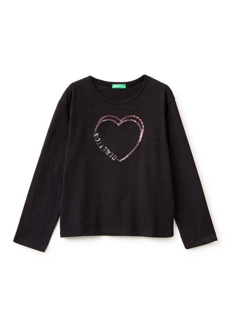 Camiseta de manga larga negra hecha de algodón, con un diseño de corazón de lentejuelas rosas y plateadas que lleva la palabra "PERFECTO" en su interior. Cuello redondo, corte holgado.