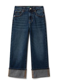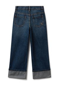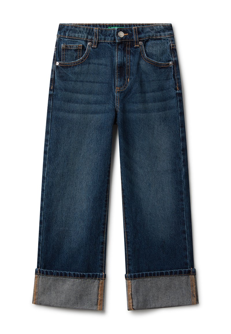 Jeans de mezclilla de pierna recta y puños en azul oscuro, con bolsillos frontales y para monedas, y costuras naranjas visibles.