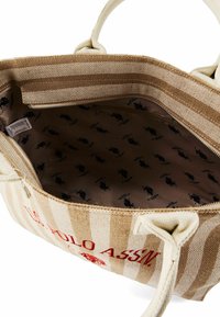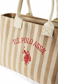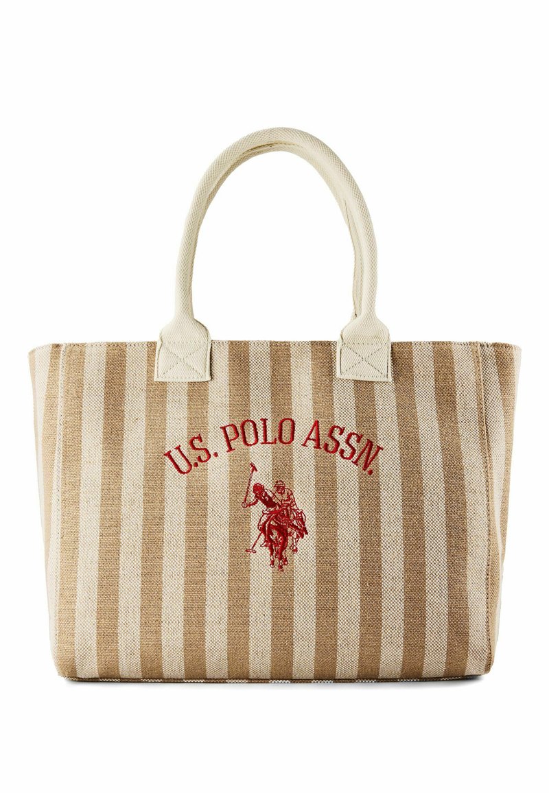 Bolso tote con rayas beige y blancas, asas blancas y logotipo rojo de U.S. Polo Assn. junto con bordado de jugador de polo en la parte delantera.
