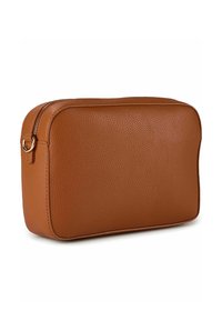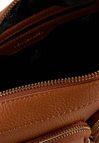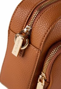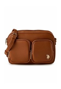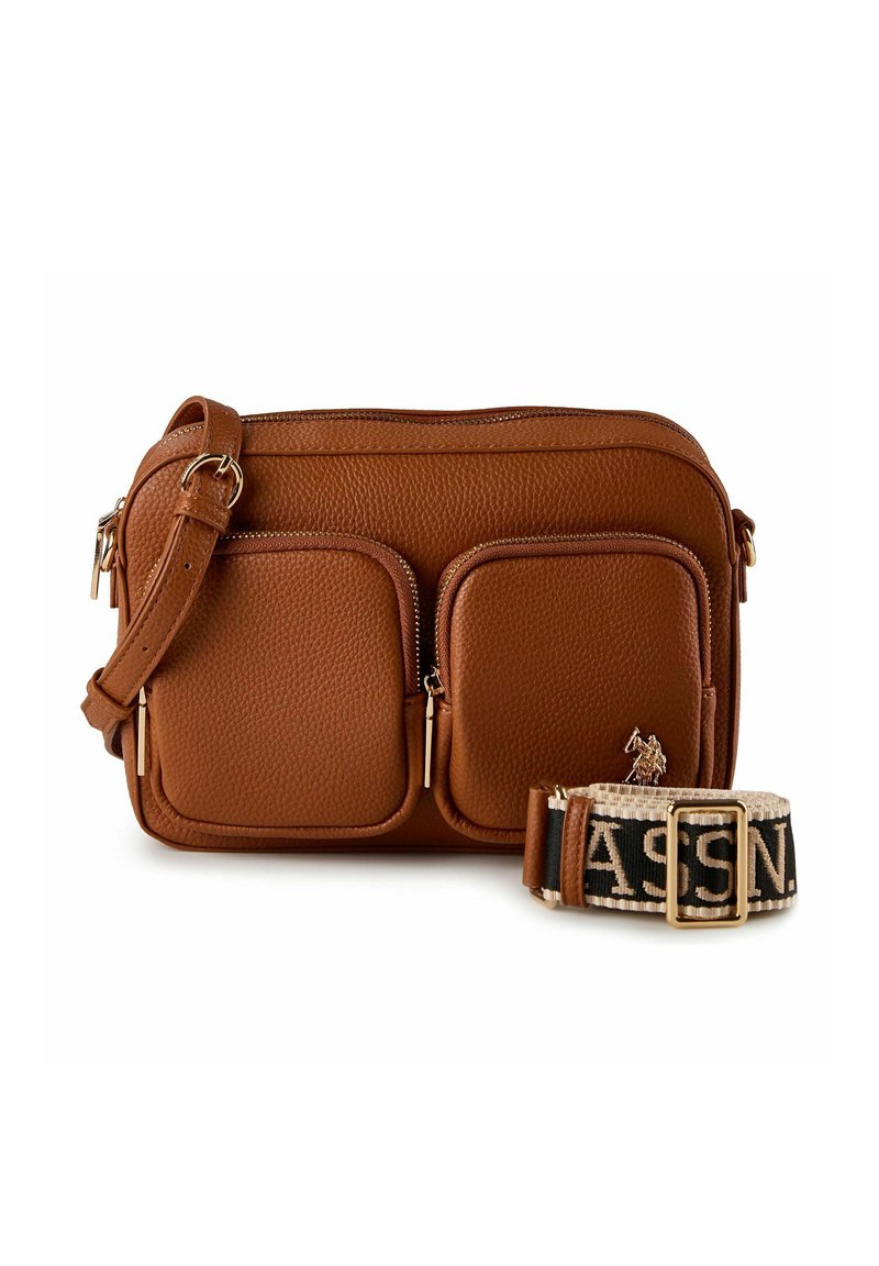 Bolso bandolera de cuero marrón texturizado con dos bolsillos frontales con cremallera y correa ajustable de lona beige y negra desmontable.