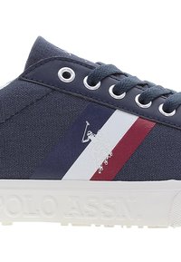 Zapatillas de lona azul marino con suela de goma blanca. Presenta rayas azul, blanca y roja en el lateral, y un nombre de marca en relieve en la suela.