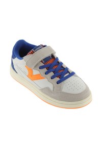Zapatillas con parte superior de cuero gris, detalles en naranja y azul marino, y una correa de velcro. Presentan una sección de ante texturizado y una suela de goma.