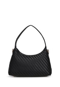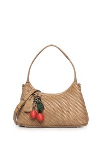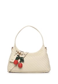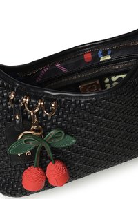 Bolso de mano de cuero negro tejido con asa corta, herrajes dorados y adornos de cuero en forma de cerezas rojas unidos a la correa.