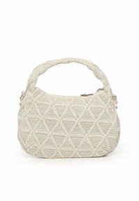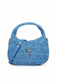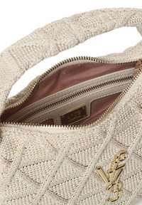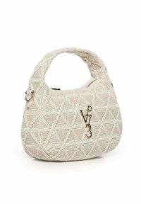 Bolso tejido beige con patrón de diamantes texturizado, asa corta acolchada, correa de cuero ajustable y colgante metálico con el logo "V73" en el frente.