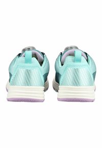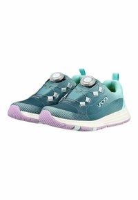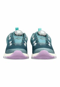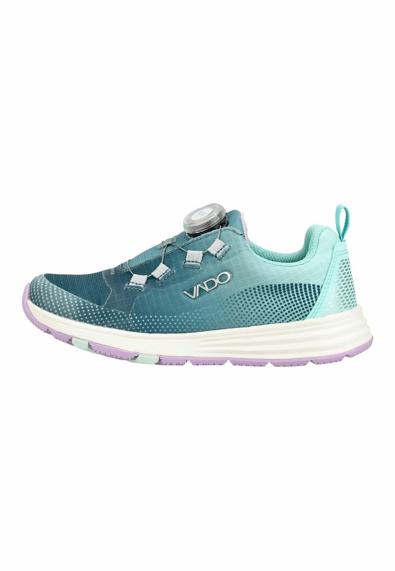Zapatilla deportiva en tonos azul verdoso y púrpura, con suela blanca, sistema de ajuste mediante dial, lengüeta de tirador en el talón y el nombre de la marca "VADO" en el lateral.