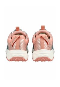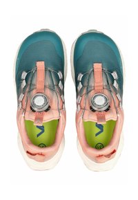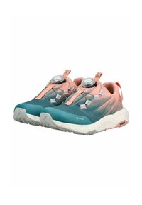 Zapatilla de trail running en degradado de verde azulado y rosa con suela blanca acolchada, material Gore-Tex y sistema de cierre con dial.