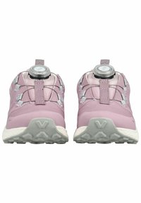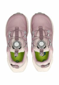 Zapato deportivo de color púrpura claro con suela blanca, parte superior de malla, sistema de cordones ajustable con dial y etiqueta impermeable Gore-Tex en el lateral.
