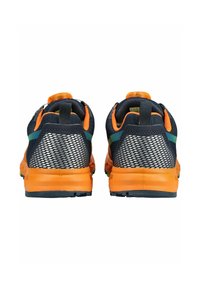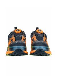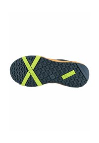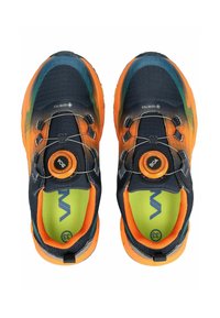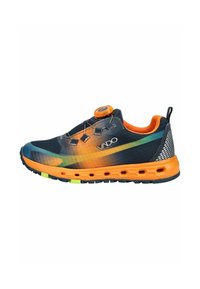 Zapatilla deportiva con suela y forro naranja, parte superior negra con degradado en verde y amarillo, con cierre de cordones giratorio y el nombre de la marca "VADO" en el lateral.