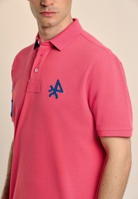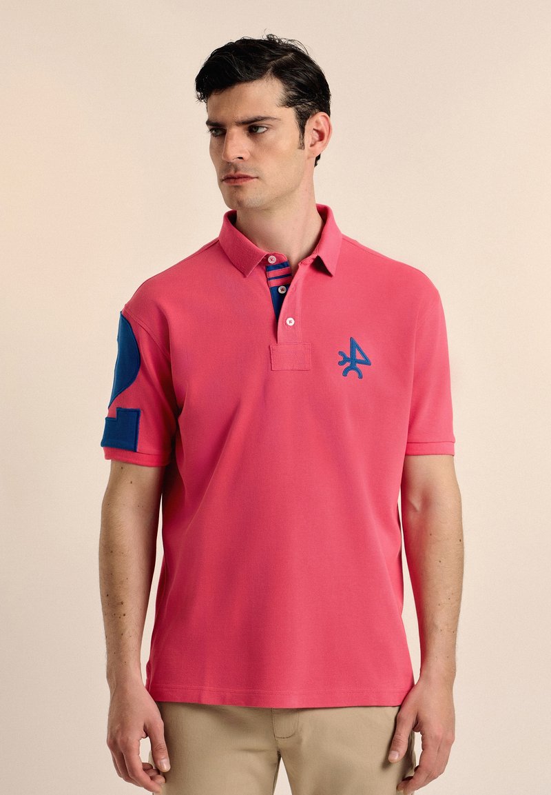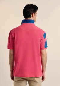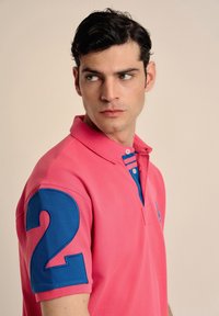 Camisa polo rosa con una tapeta de dos botones, acentos azules en los hombros y un logo azul en el pecho. Mangas cortas, tela texturizada.