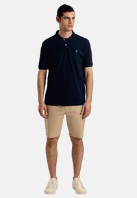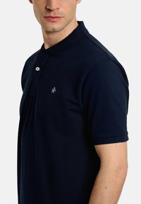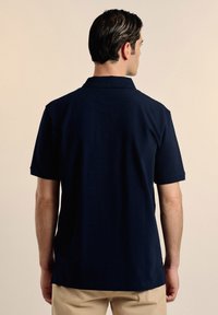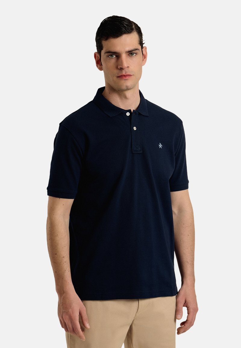 Camisa polo azul marino de algodón, con un cuello clásico, tapeta de tres botones y un pequeño logo bordado en el pecho.