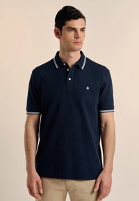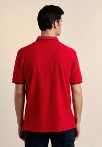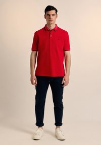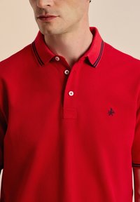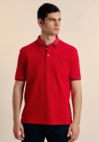 Camisa polo roja con cuello a rayas en navy, tapeta de dos botones y un pequeño logo en el lado izquierdo del pecho. Mangas cortas, tejido suave.