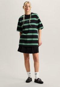 Persona que lleva una falda negra plisada, camiseta de rayas verdes y negras, calcetines blancos Vans y zapatos negros con cordones, de pie con las manos en los bolsillos.