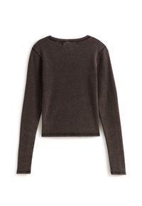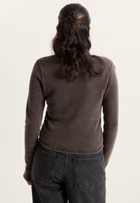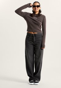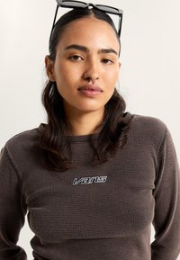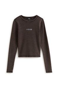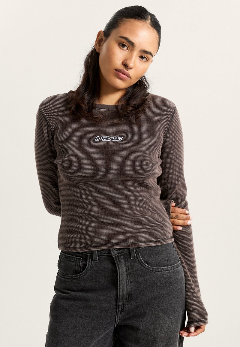 Camiseta de punto waffle marrón de manga larga con un escote redondo y el logo blanco de "Vans" en el pecho. Combinada con jeans negros de cintura alta.