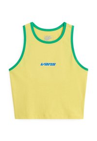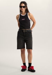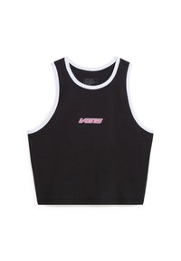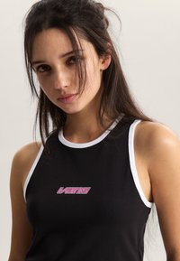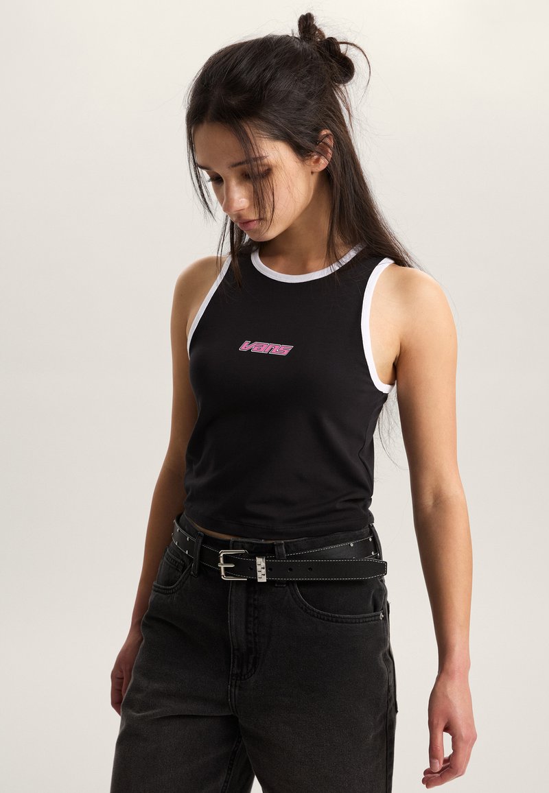 Top negro sin mangas con ribete blanco, que presenta un logo rosa de "Vans". Combinado con jeans negros de talle alto y un cinturón con adornos plateados.
