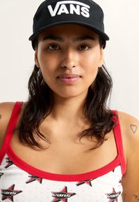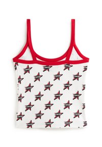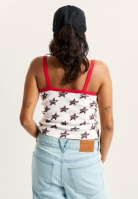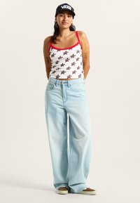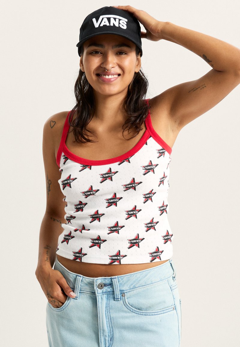 Camiseta sin mangas blanca con ribete rojo, que presenta un patrón de estrellas repetitivo en rojo y negro, combinada con jeans de un azul claro y una gorra negra.