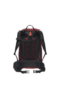 Mujer con una mochila Vaude bicolor en tonos rosa y vino, mirando hacia la izquierda, vestida con una chaqueta beige de textura y pantalones negros sobre un fondo blanco.