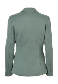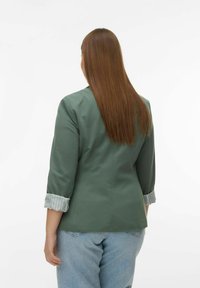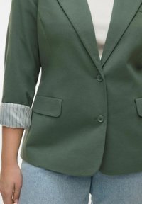Blazer verde oliva con solapa con muesca, dos bolsillos delanteros y puños de las mangas arremangados con rayas. Tejido texturizado con un ajuste entallado.