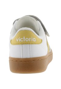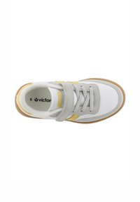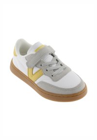 Zapatilla blanca con detalles en gris y amarillo, cierre de velcro, parte superior sintética lisa, suela de goma con textura y logo lateral en forma de "V".