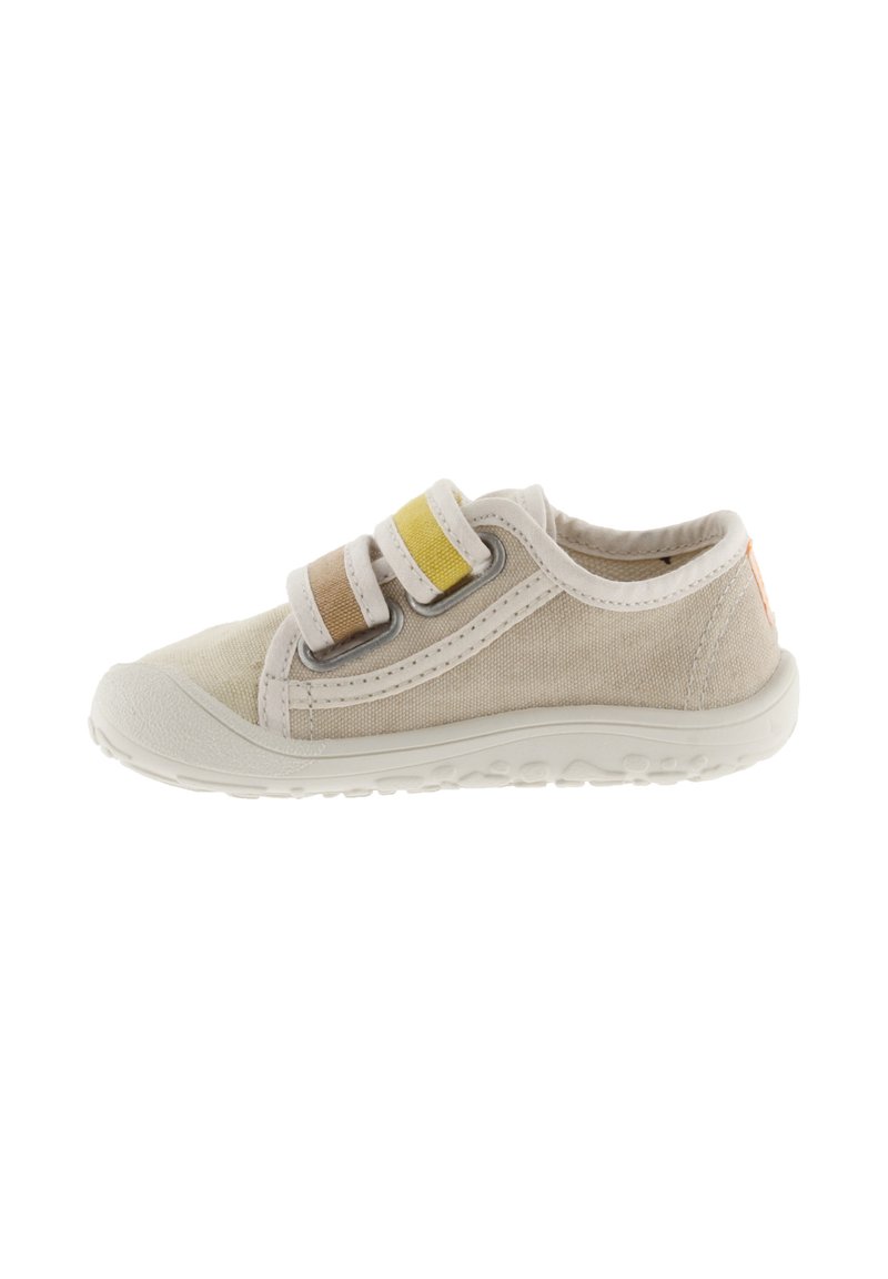 Zapatilla de color beige claro con parte superior de lona texturizada, correas elásticas en amarillo y marrón, y una suela de goma con patrones antideslizantes. Cuenta con un diseño de perfil bajo.