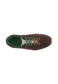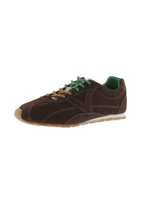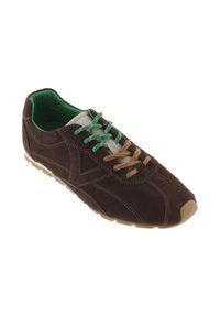 Zapatillas de ante marrón con cordones y forro verde, que presentan una suela de goma lisa y detalles de costura para mayor textura.