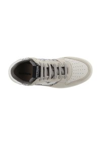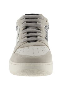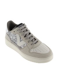 Zapatilla gris claro con una punta de cuero suave, panel lateral plateado brillante y parte trasera texturizada gris. Suela de goma con un diseño plano.