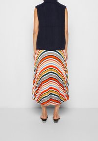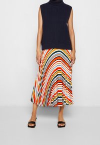 Suéter sin mangas de cuello alto azul marino con patrón de punto trenzado, combinado con una falda plisada a rayas multicolores.