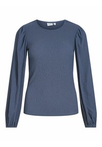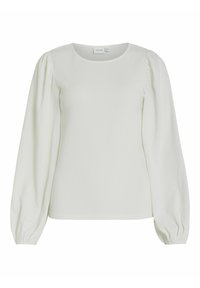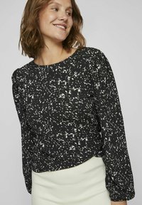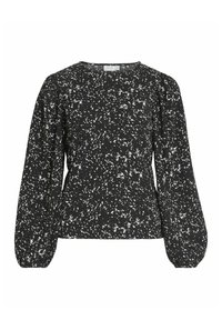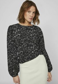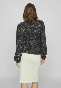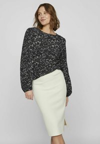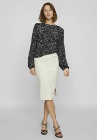 Blusa negra con un patrón salpicado de blanco, de mangas largas, combinada con una falda lápiz ajustada de color verde claro que presenta una abertura lateral.