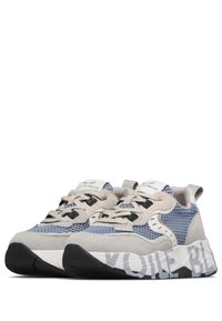 Zapatilla de malla gris y azul con superposiciones de ante, cordones en la parte frontal, suela blanca gruesa con texto "VOILE BLANC" y tira para tirar en el talón.