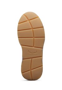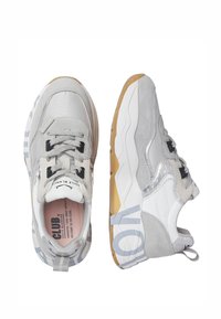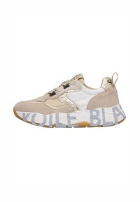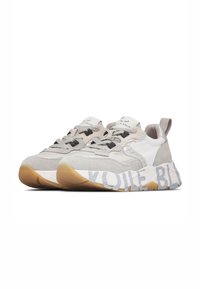 Joven mujer con chándal beige agachada, descansando la cabeza sobre las manos, lleva zapatillas grises y blancas con suelas de goma.