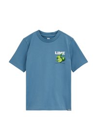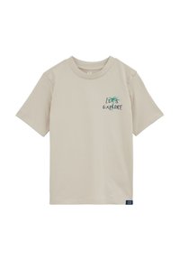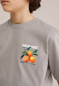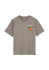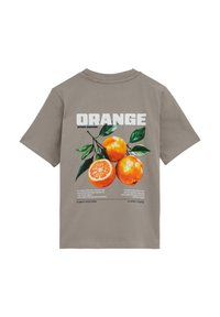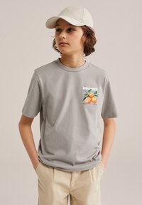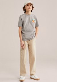 Niño con camiseta gris con gráfico de fruta naranja, pantalones beige, zapatillas blancas y gorra beige, de pie con una mano en el bolsillo.