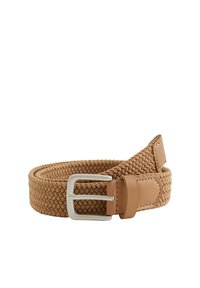 Cinturón tejido en navy hecho de material elástico, con una hebilla metálica rectangular y un adorno de tirante de cuero para un ajuste seguro.