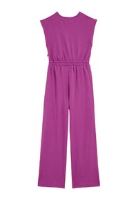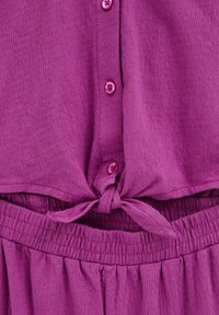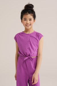 Chica con gafas de sol redondas, una blusa morada sin mangas con botones atada a la cintura, pantalones anchos a juego y sandalias negras.