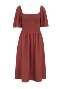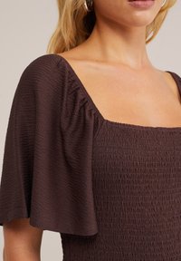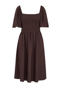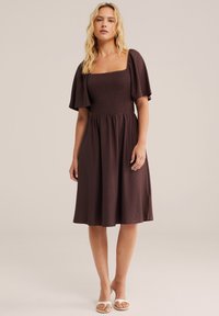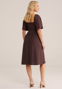 Mujer rubia con un vestido midi marrón texturizado, con cuello cuadrado y mangas acampanadas, posando frente a un fondo liso.