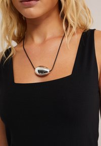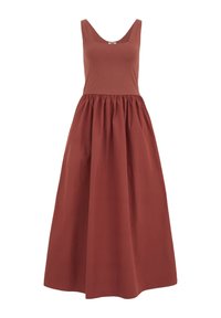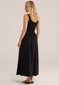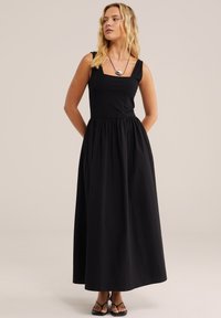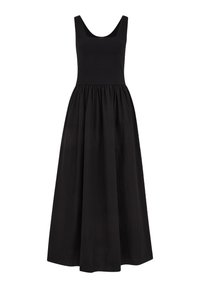 Mujer de cabello rubio con un vestido maxi negro sin mangas de escote cuadrado y sandalias negras, de pie con las manos detrás de la espalda.