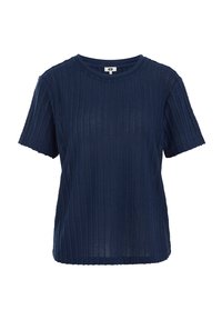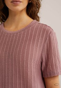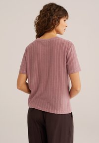 Mujer con cabello rizado que lleva una blusa corta texturizada de color malva y pantalones negros holgados, de pie con las manos detrás de la espalda.