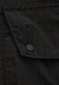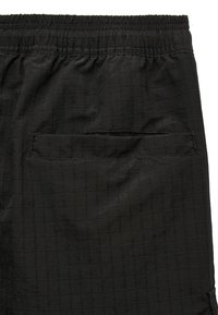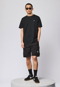 Hombre con pantalones cortos cargo negros, calcetines negros y zapatillas negras, de pie sobre una plataforma redonda gris contra un fondo liso.