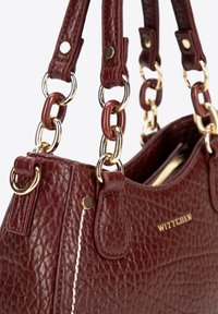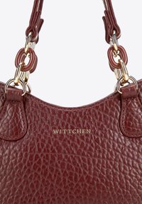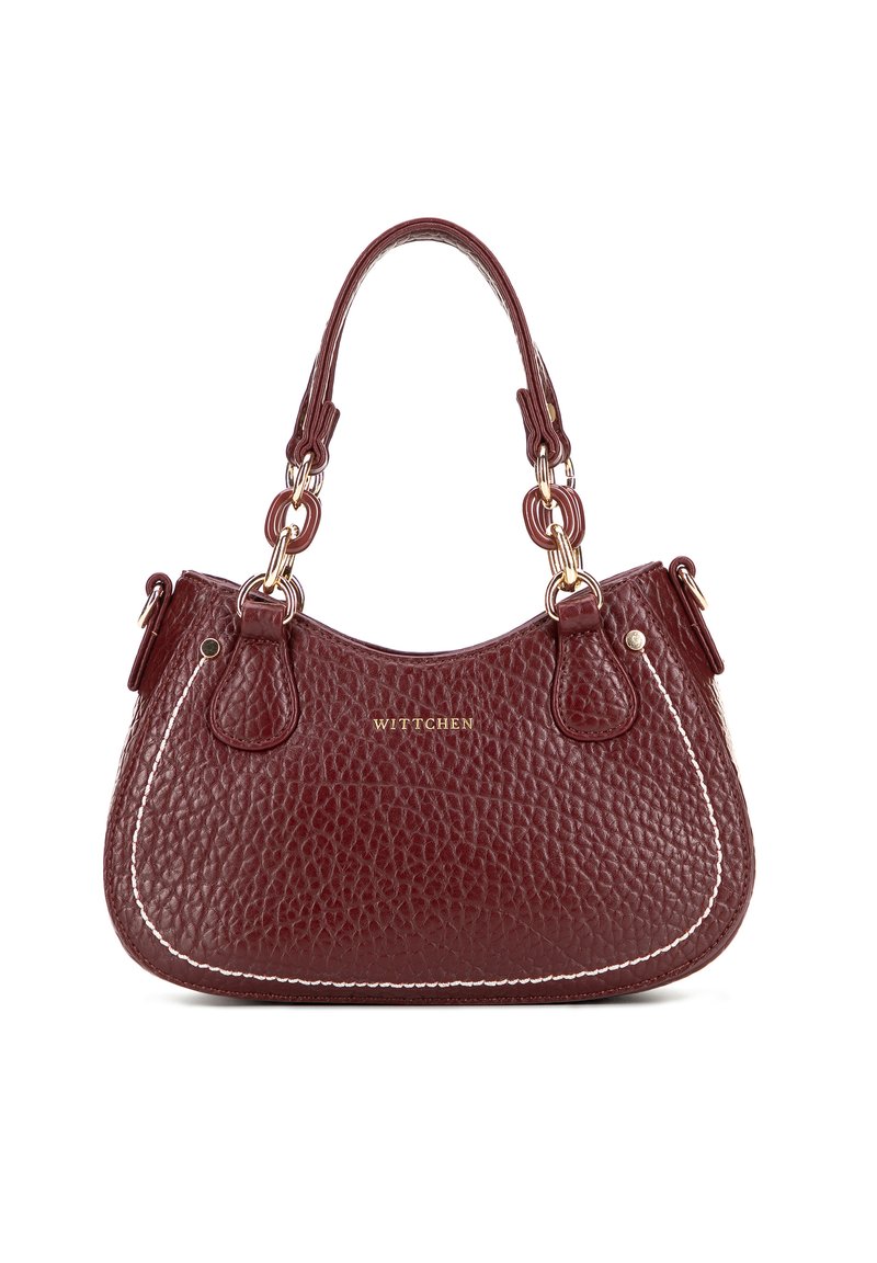 Bolso de mano de cuero texturizado rojo oscuro con asas dobles, eslabones de cadena dorada, costuras blancas y el logo "WITTCHEN" en el centro frontal.