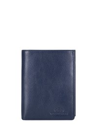 Cartera de cuero marrón oscuro con una textura suave, que presenta esquinas redondeadas y un sutil logo en relieve en la esquina inferior derecha.