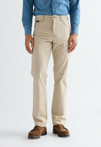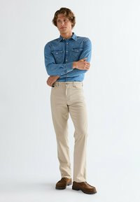Hombre con pantalones beige, zapatos de ante marrones y una camisa de mezclilla azul, de pie frente a un fondo blanco liso.